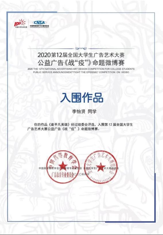 获第十二届大广赛“战疫”入围作品奖