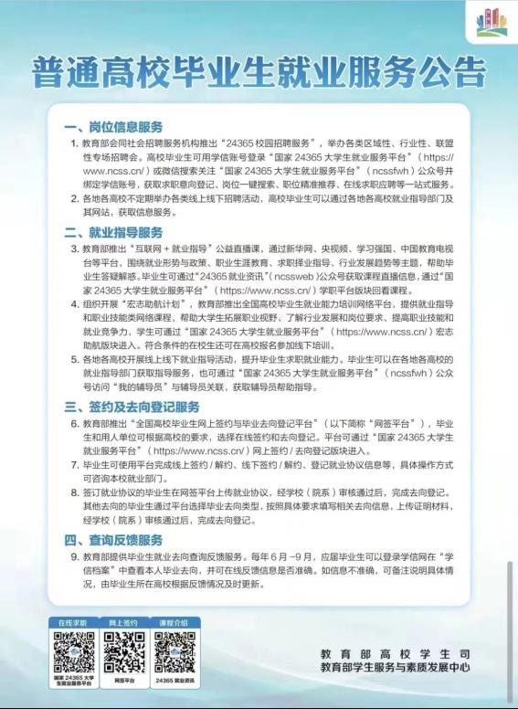 教育部推出"24365校园招聘服务",举办各类专场招聘会,在平台可进行岗位搜索、职位推荐、在线求职等服务。