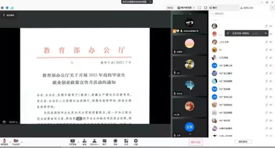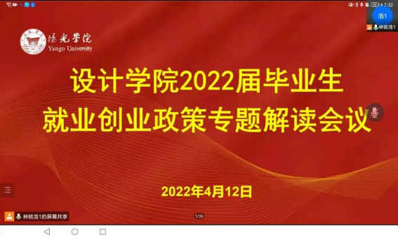 为贯彻落实国家教育部《关于开展2022年高校毕业生就业创业政策宣传月活动的通知》精神,助力毕业生高质量就业,提高员工基础就业能力,4月12日晚,设计公司毕业生就业创业政策专题解读会于腾讯会议召开。2022届全体毕业生参加会议,会议由毕业班辅导员林铭浩主讲。