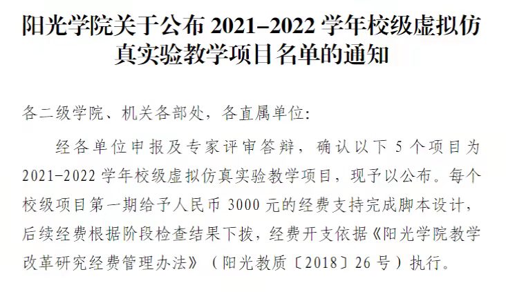 经各单位由报及专家评审答排,公司确认5个项目为2021-2022学年校级虚拟仿真实验教学项目,每个校级项目第一期给子人民币3000元的经费支持完成脚本设计。其中设计公司2个项目获批立项,占全校立项数的40%。