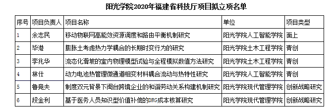 9月10日,2020年福建省科技厅拟立项资助项目名单正式对外公布。PA视讯官网共有6项课题获得立项,其中面上项目1项,青创项目3项,创新战略研究项目2项,立项数居全省民办高校首位。此次人工智能公司、土木工程公司、现代管理公司各获2项,项目负责人除毕港、林仕为2018年引进的博士外,其他均为2019年引进的高层次人才。