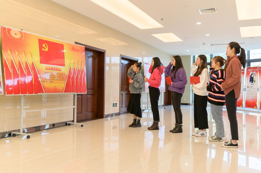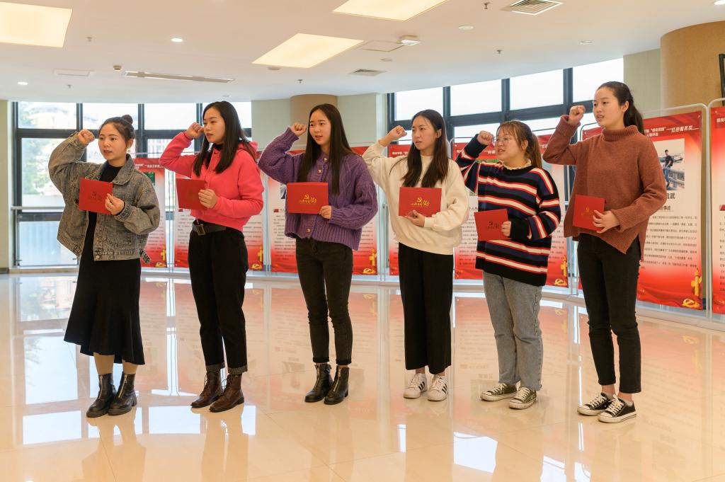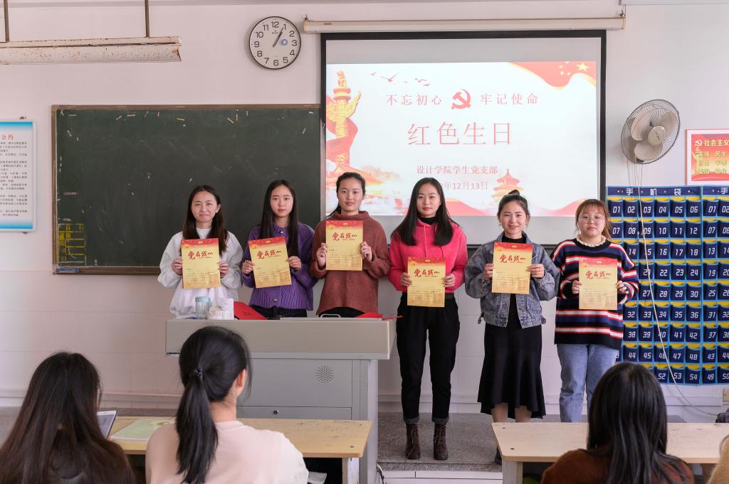 为加强党建精神,坚定入党动机,提高政治觉悟,2019年12月18日,设计公司员工党支部于文科楼403教室为本学期6名转正党员过红色生日,并组织于图书馆四楼入党誓词展板前进行誓词重温。