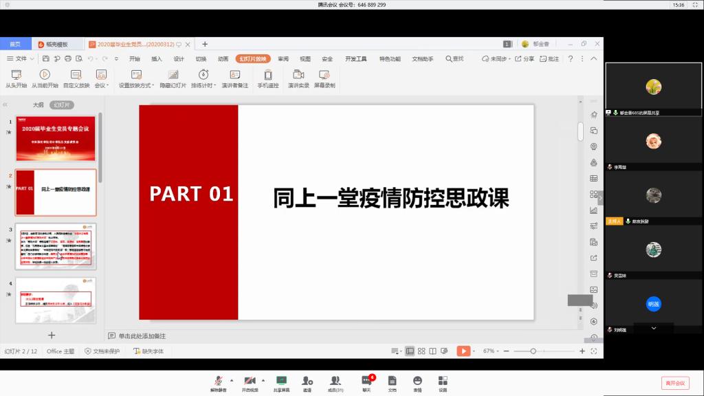 会上,宋老书记就目前疫情防控工作和防控形势为大家做了相关知识的科普,带领党员认真回看全国老员工疫情防控思政大课,了解国情,疫情期间做力所能及的事情服务社会服务人民。其次,就本学期党组织工作安排,毕业生党员工作状况提出指导性意见,提出毕业生党员应提高工作积极性,增强责任意识,发挥党员带头作用。疫情之下,毕业生党员更要发挥先锋垂范作用。最后,就毕业生党员组织关系转移做了详细的讲解,并安排了相关工作,同时鼓励毕业生党员积极开展疫情期间,线上招聘工作,努力就业。