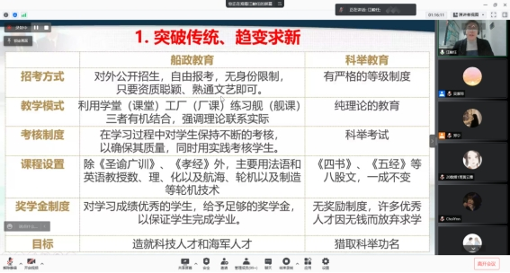 江峻任老师强调,船政学堂在满是需要传承技艺的传统社会中受阻很大,它的办学理念、办学模式在当时是先进的。他总结得出:对比传统教育,船政学堂特色在于突破传统,引进欧洲教育模式,聘请外教,突破身份限制,广征人才。其次,船政学堂在办学体制上,采取政府统筹、厂校一体化的形式,深刻践行理论融于实践。再者,船政学堂特色在于课程实用,针对性强,以国家急需的应用型技术人才为培养目标,更是以创新为基底,开创留学先例,促进文化交流,推动中国教育近代化发展,促进社会近代化进程。