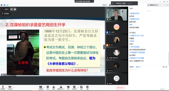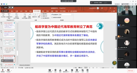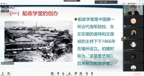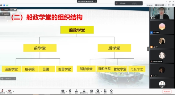 在这堂特殊的线上党课中,江峻任教授以“船政教育文化”为主线,围绕“讲一座学堂”“品一段文化”“学一种精神”“担一段使命”四个方面,由浅入深,向在座同学娓娓道述船政学堂的创办及办学特色,阐述船政文化和船政精神,予以感悟。集体学习过后,与会员工党员、积极分子纷纷发表了学习感悟,大家一致认为江峻任老师的党课幽默风趣并且丰富深度,深化了在场员工们对船政精神内涵的理解和传承。
