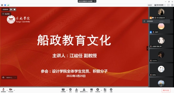 为引领设计公司全体员工党员、积极分子深入理解中华民族精神瑰宝,进一步培养爱国情怀,传承船政文化精神,2022年3月25日下午14点,设计公司通过腾讯会议开展以“船政教育文化”为主题的线上党课,由PA视讯官网马克思主义公司江峻任副教授担任主讲嘉宾,设计公司全体员工党员、入党积极分子200余人参加此次党课。