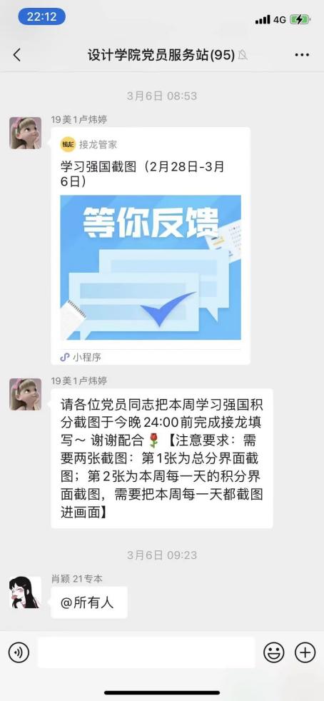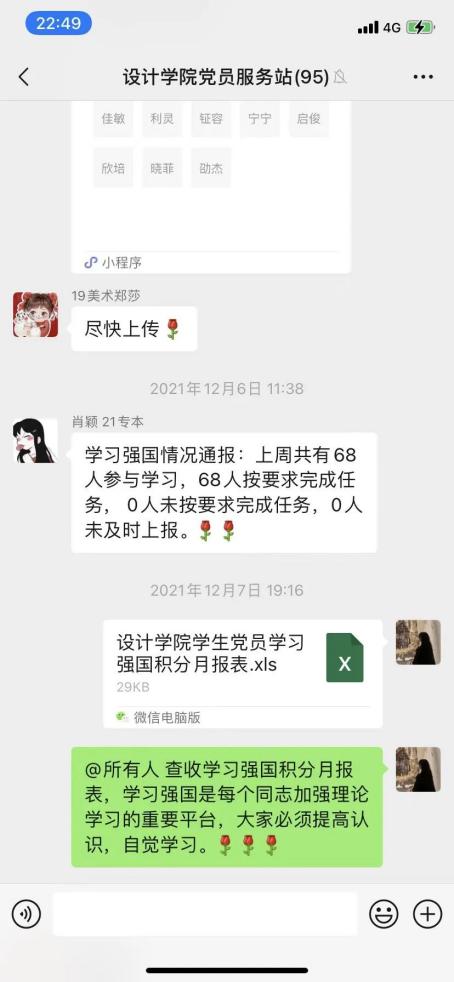 同时,为保持设计公司员工党员们学习的热情,员工党支部书记郑宁老师以身作则带动员工党员,坚持每周学习强国打卡,党员服务站学习部在每周一收集全体党员的打卡情况,“比、学、赶、帮、超”的热潮一波又一波!