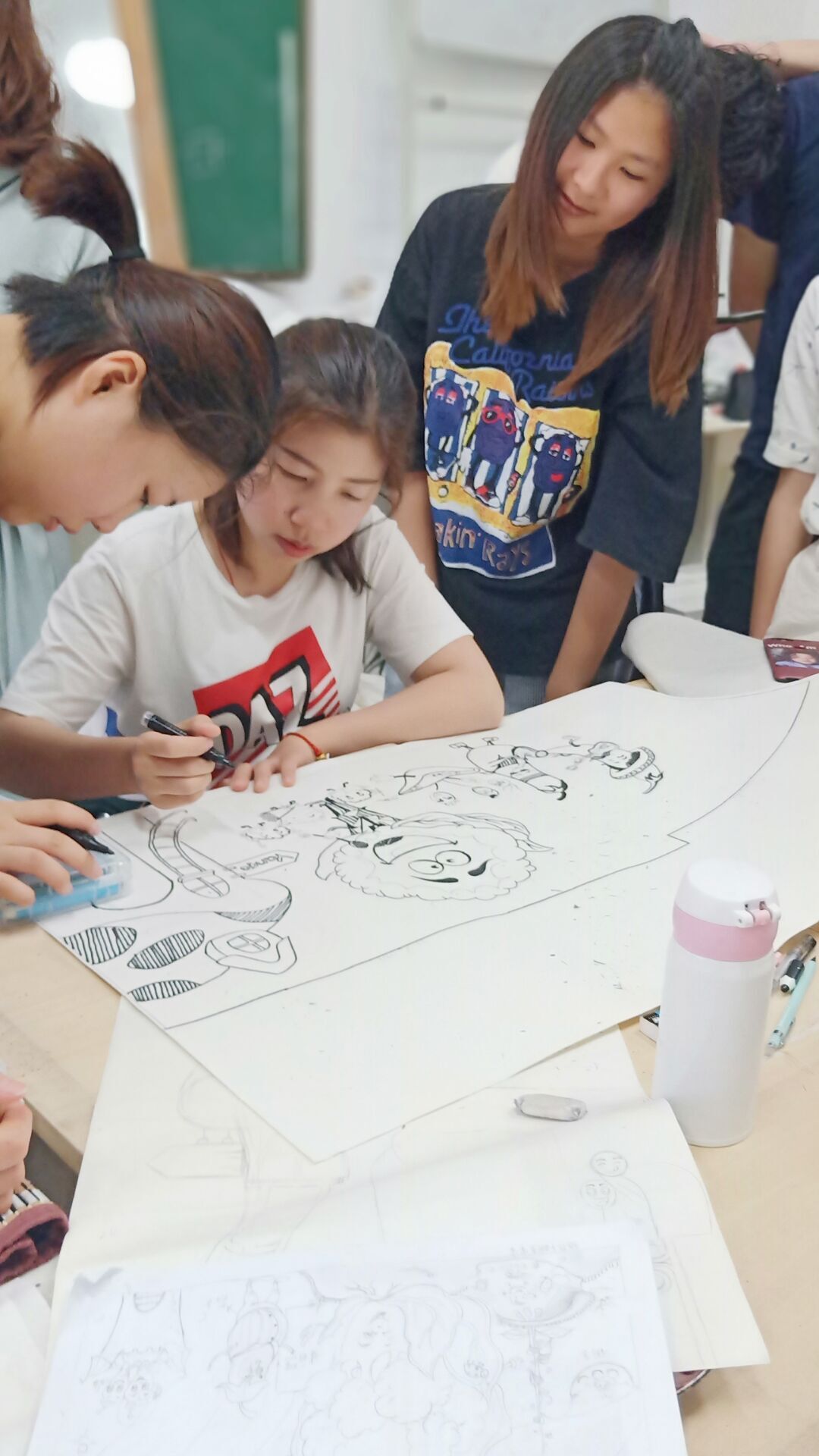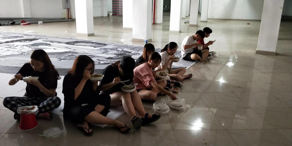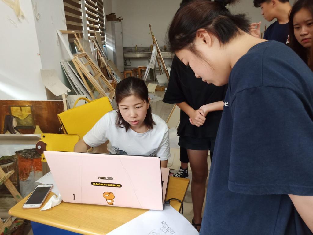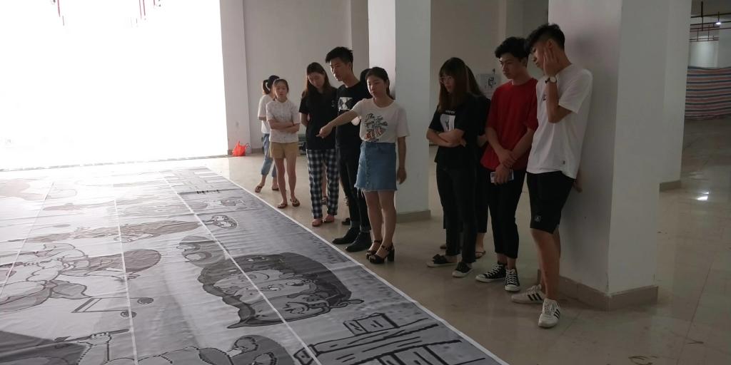 前期工作:7月12日,我们在创四方园停车场进行第一次效果图展开,陈晓珊老师对效果图提出了一些建议,同学们针对建议对效果图的不断调整,最终对主题人物进行上墙实验。此次墙绘我们使用的主要材料是油漆,由于第一次使用油漆,还对油漆的味道不太适应,但是经过同学们的努力,此次主体人物上墙实验顺利完成,相信同学们在之后的实地作画中会更加完美。