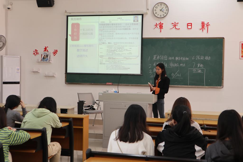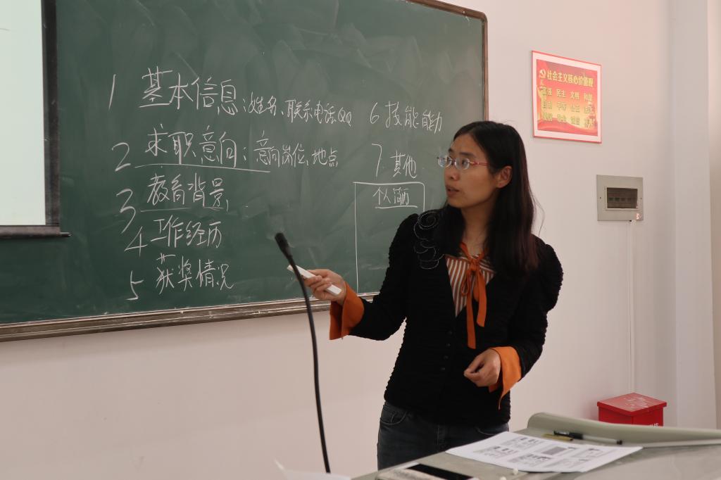 培训会伊始,吴其枝老师根据自己多年的职业生涯规划经验向在座的同学阐述一份简历在求职过程中所占的关键性的作用。一份好的简历需要从内容到措辞处处仔细推敲,吴其枝老师从基本信息、求职意向、教育背景、工作经历、获奖情况、技能能力和其他七个方面给在座的同学们传授做一份优秀简历的技巧,并且通过形象生动的案例让同学们更好地了解如何去做好一份简历。