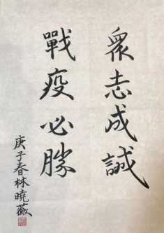 首先,我想到的就是冲在最前线的医护人员,他们站在最危险的地方,做着最苦最累的事,还有照顾不完的病人“每天和数字赛跑、和时间赛跑、和生命赛跑……”把安全留给别人,把危险留给自己。他们集中住宿、轮流隔离休息,以对人民群众生命安全和身体健康高度负责的态度,奋斗在抗击疫情工作的一线,为打赢这场没有硝烟的战争做出一个中国人应有的坚守和奉献。他们的付出换来的就是国家和人民的安全,所以对医护人员我们永远都应该保存一颗敬畏之心。而我们在无法像医护人员在一线抗击疫情时,所要做的就是管理好自我,疫情就是命令,防控就是责任,不要外出,待在家里上网课,而相比公司,其实在家可以学习的时间更长,我们可以充分利用更长的时间去学习,在没事的时候也可以静下心来写毛笔来充实自己,疫情当前,这便是对国家最大的帮助。