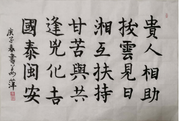 针对“疫情”主题,我选取了全国各地医疗队伍的萌萌代号来进行书法创作,各个队伍的萌萌代号都是用各个省来代替成语中的相音词,代表的是全国各省。所以我将它们运用组合成了一段话”贵人相助,拨云见日,湘互扶持,甘苦舆共,逢凶化吉,国泰闽安”。所表达的就是全国各地,众志成城同心协力一起抗击疫情,最终将会是云开见月明,国泰民安的一个情形。
