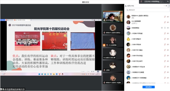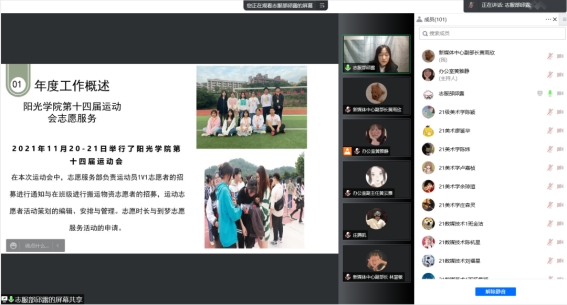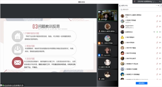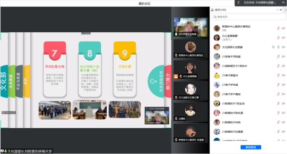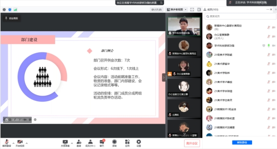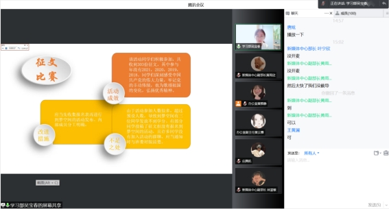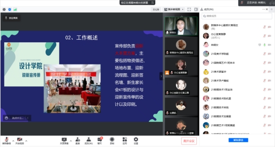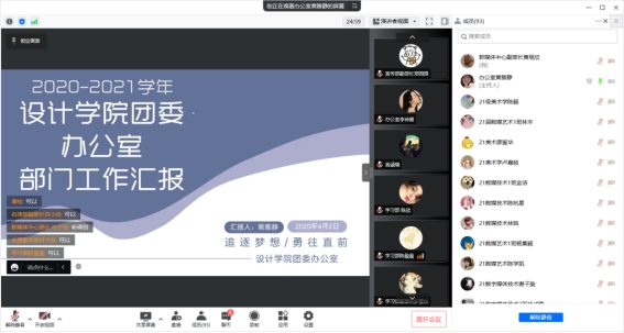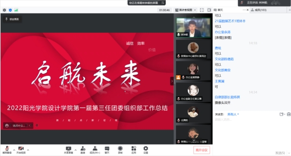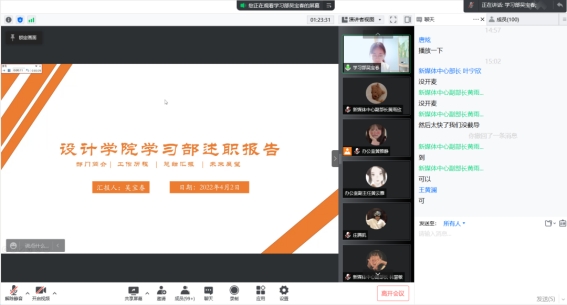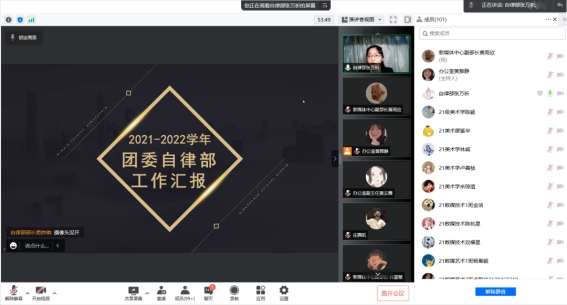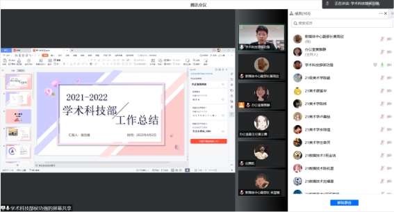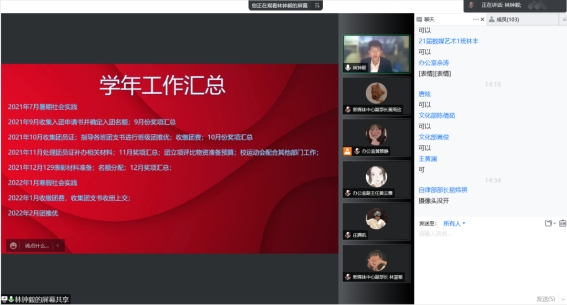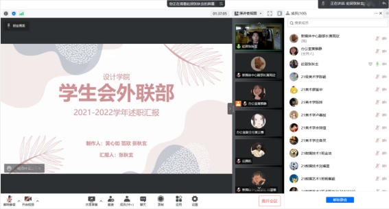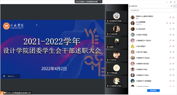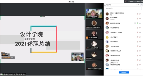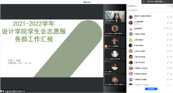 为了更好展示设计公司团委员工会各部门风采,2022年4月2日下午,设计公司通过腾讯会议开展2021-2022学年设计公司团委员工会干部述职大会,设计公司办公室主任兼团委书记吴其枝老师、党支部书记兼辅导员郑宁老师、2018级辅导员林铭浩老师、设计公司团委员工会主席团全体成员和设计公司团委员工会全体干部干部参加本次述职汇报会。