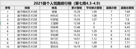 根据《PA视讯官网关于开展2022年悦跑排位赛的通知》,每周通过“步道乐跑”APP中显示的班级平均里程数,公司对本周参与悦跑的班级进行排名。现将2021级、2020级排名前5名的班级以及优秀悦跑个人公示: