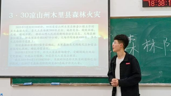 杨志成同学深刻讲述了“3·30”凉山森林火灾事件,在救援过程中因火场风向突变、风力陡增、飞火断路、自救失效,致使参与火灾扑救的19人牺牲、3人受伤。这起森林火灾造成各类土地过火总面积3047.7805公顷,综合计算受害森林面积791.6公顷,直接经济损失9731.12万元。这是森林火灾带给人类的灾难,人的力量是很渺小的,大自然的另一面是具有警示性的。他提醒班级同学们要时刻有着森林防火意识,同时,再次强调了在宿舍区域内不能使用高功率电器以及蜡烛、火柴等,以免产生安全隐患。