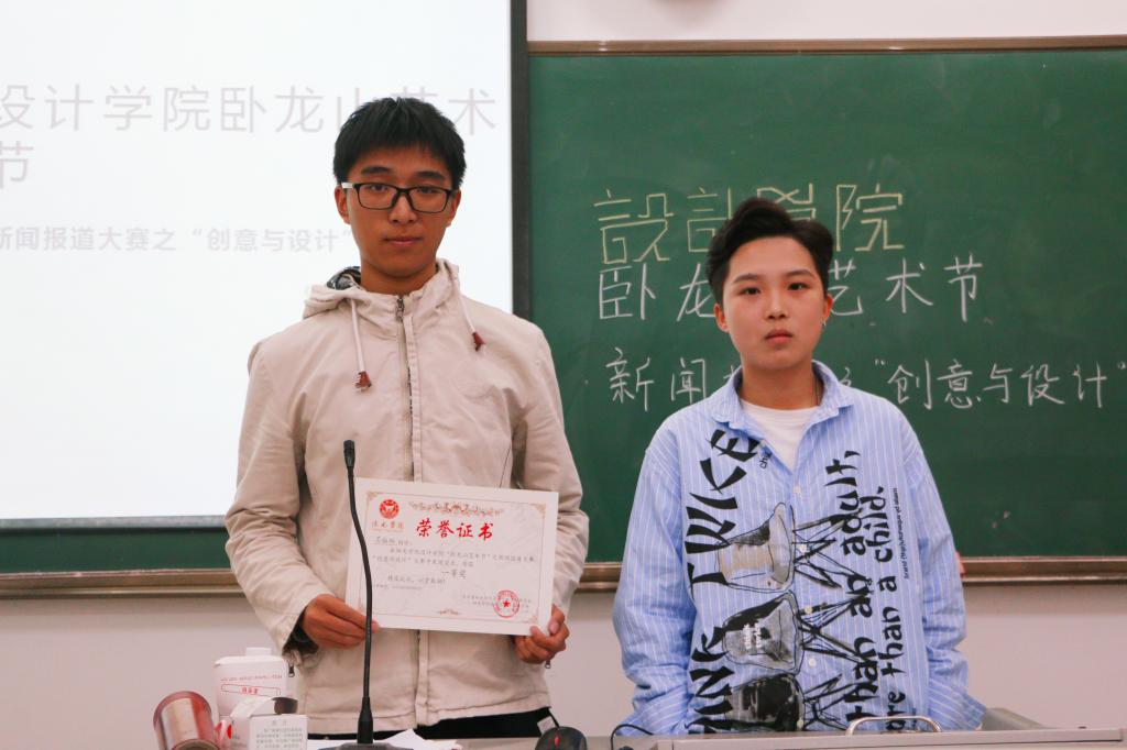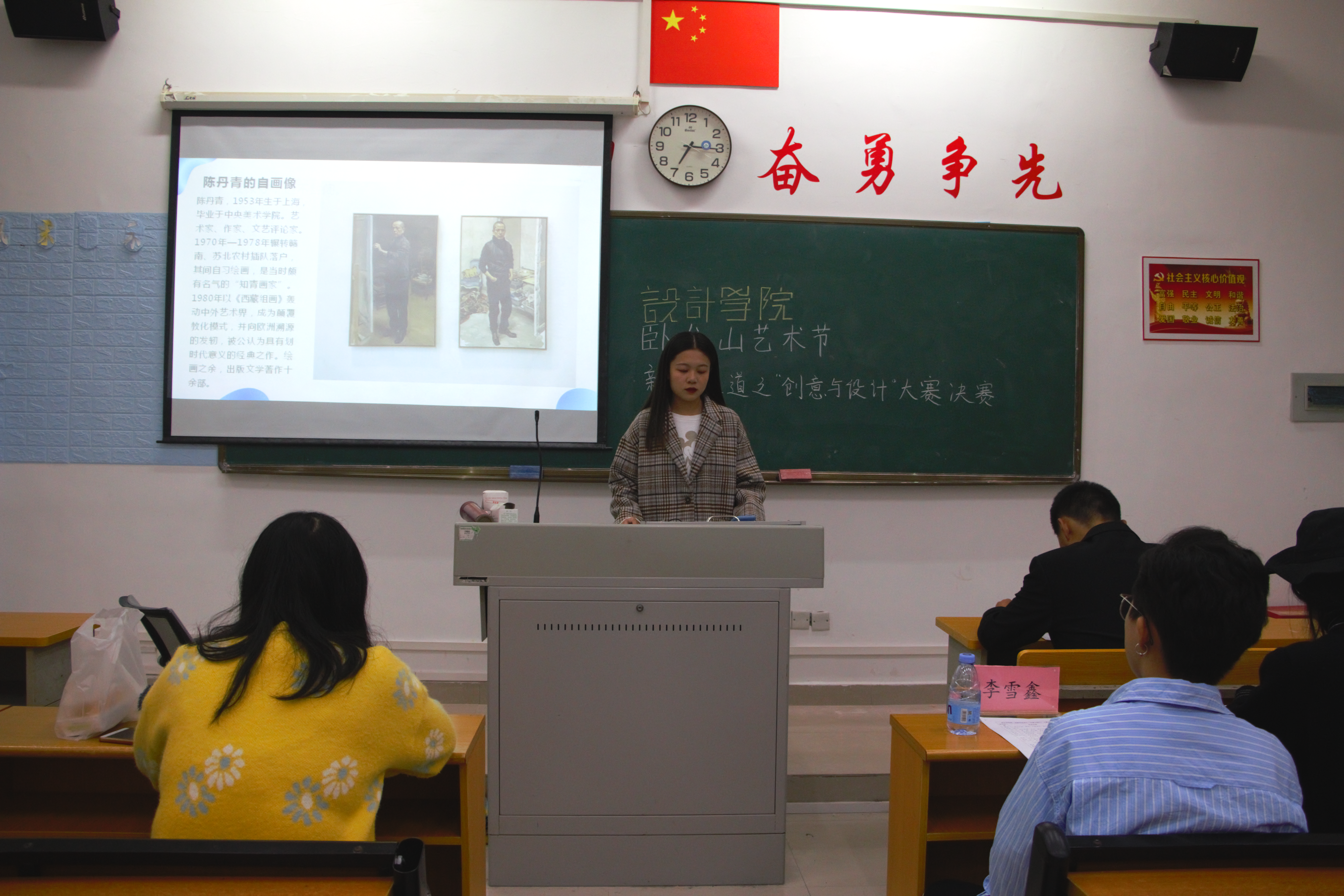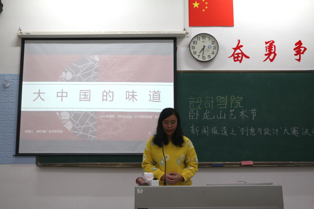 比赛伊始,主持人向观众介绍本次大赛流程以及评比细则,接着由参赛选手依次结合PPT对自己准备的资料进行报道。首先登场的一号选手苏柏旭向观众介绍了天才海报设计师——黄海,黄海于2007年设计第一份电影海报制作《太阳照常亮起》,2014年根据《黄金时代》演员做出令人喝彩的五张作品。他的许多作品被众人所知,他的设计被称为“崛起的中国设计”。二号选手林爱娟介绍了画家陈丹青,“我保守但不封闭”是陈丹青的自我认知,因1980年《西藏组图》他走入大众视野。陈丹青的《退步集》也广为人知,他说他在作品中看见变化,看见“进步”与“退步”,他是,写实的、传统的、保守的,但并不封闭。三号选手陈鑫婷介绍摄影机谈婉蓉,谈婉蓉作品在全球最大摄影会展被展出,《绿椅子》《曼哈顿一角》都让人震撼。她说“想留下的不仅是真诚与浪漫,而是艺术上不可磨灭的痕迹。”四号选手唐炫介绍了艺术家刘韡,他的作品在克利天兰艺术博物馆举行了展览《看不见的城市》,他借助电脑技术来完成图像生成和建模。他向物质告别,凭想象和创作机制搭建全新的微观世界。五号选手苏雨欣介绍齐树伟,他根据中国民族特色,围绕客户需求从产品角度进行设计,做出大中国的味道。