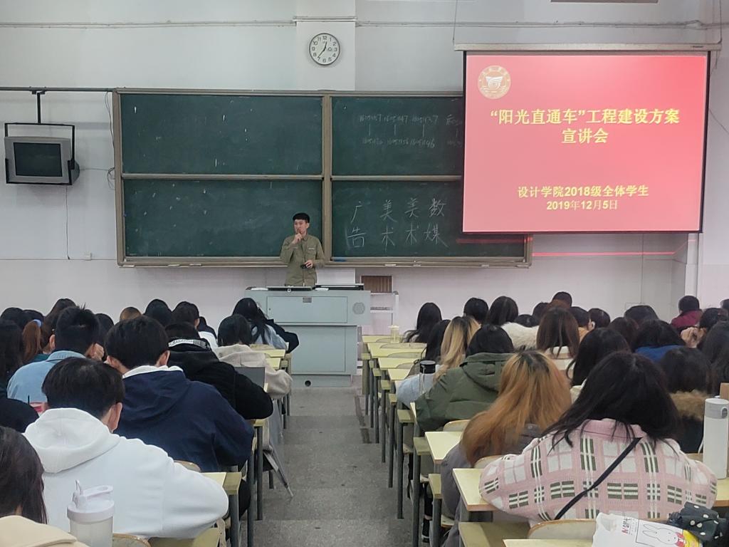 为了做好“阳光领航班”公司招募工作,12月5日下午,设计公司在文东2教室面向2018级全体员工开展主题宣传会,辅导员林铭浩针对“阳光直通车”工程建设方案展开主题宣讲。