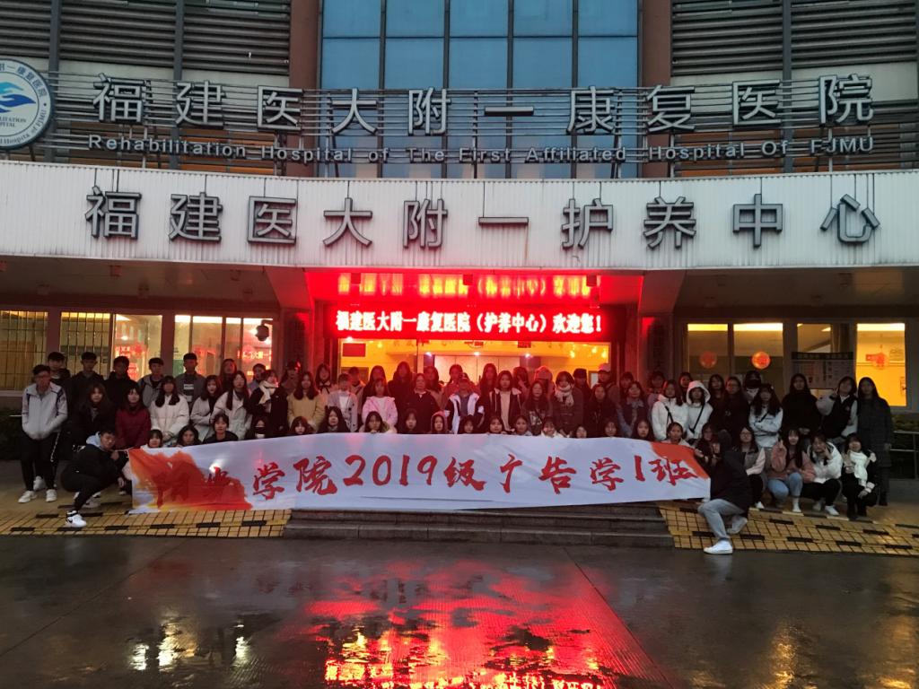 2019年12月5日下午,设计公司2019级广告学1班全体成员在班委的带领下来到福建医大附属第一康复医院进行慰问老人的志愿活动,活动由班长林岳炀、团支书陈泽佳组织,全体成员参加。