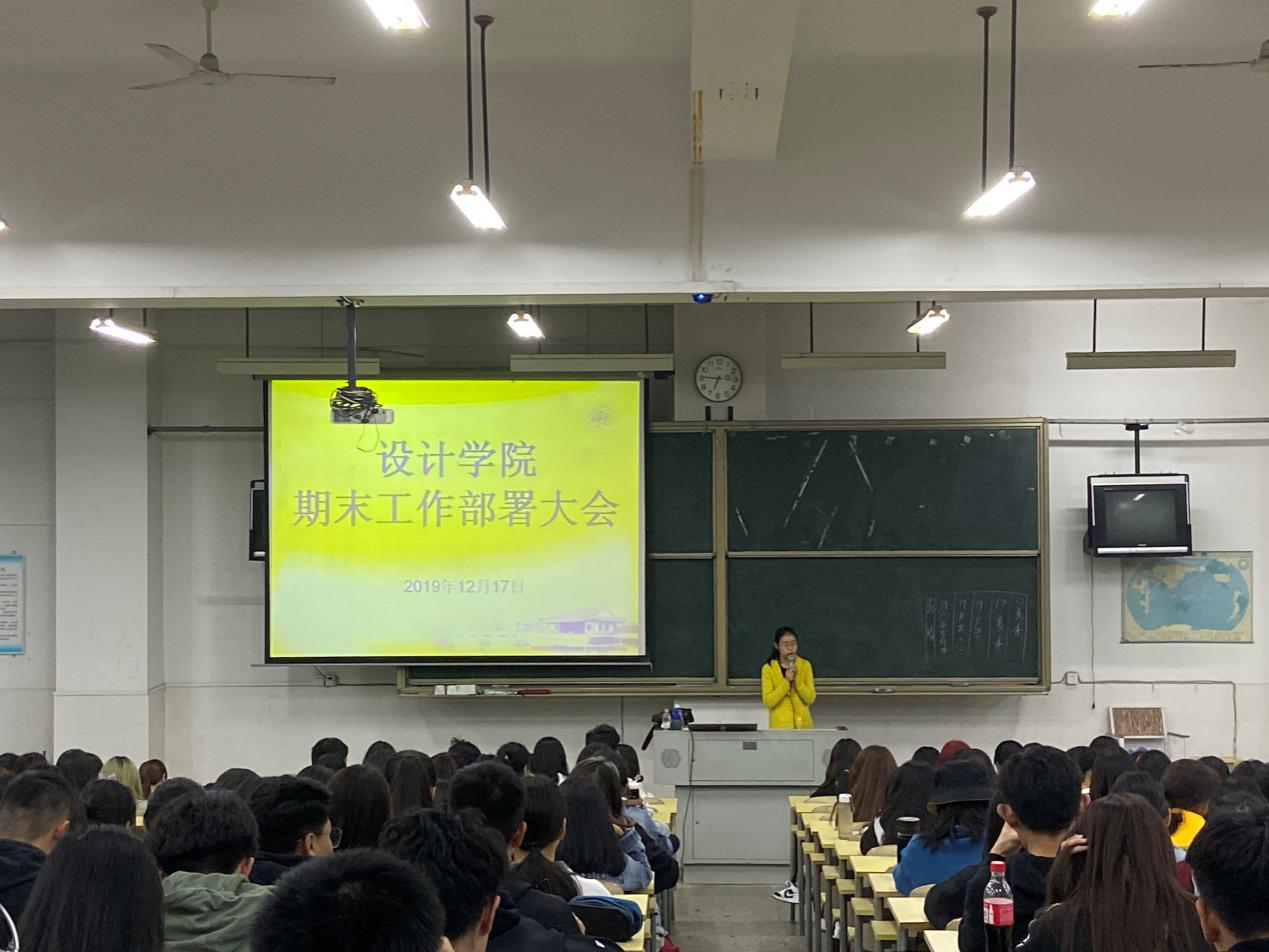 2019年12月17日晚上18:30,设计公司辅导员吴其枝老师在文科楼东1教室组织召开设计公司期末工作部署大会暨设计公司温书迎考动员大会。设计公司2019级全体同学及2017级美术学专业全体同学参会。