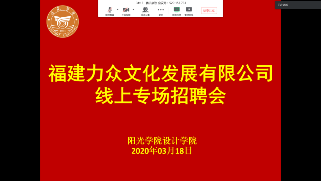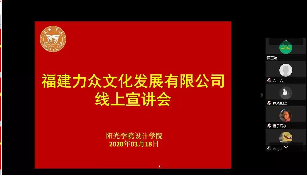 受新冠肺炎疫情影响,2020届毕业生的就业工作受到前所未有的挑战。经设计公司信息会研究,决定开启线上专场招聘会,并积极推荐企业面向本院毕业生招聘。3月18日下午,首场专场招聘通过腾讯会议展开,设计公司办公室主任兼毕业班辅导员吴其枝主持会议,福建⼒众⽂化发展有限公司创始人张兆升总经理等人出席。