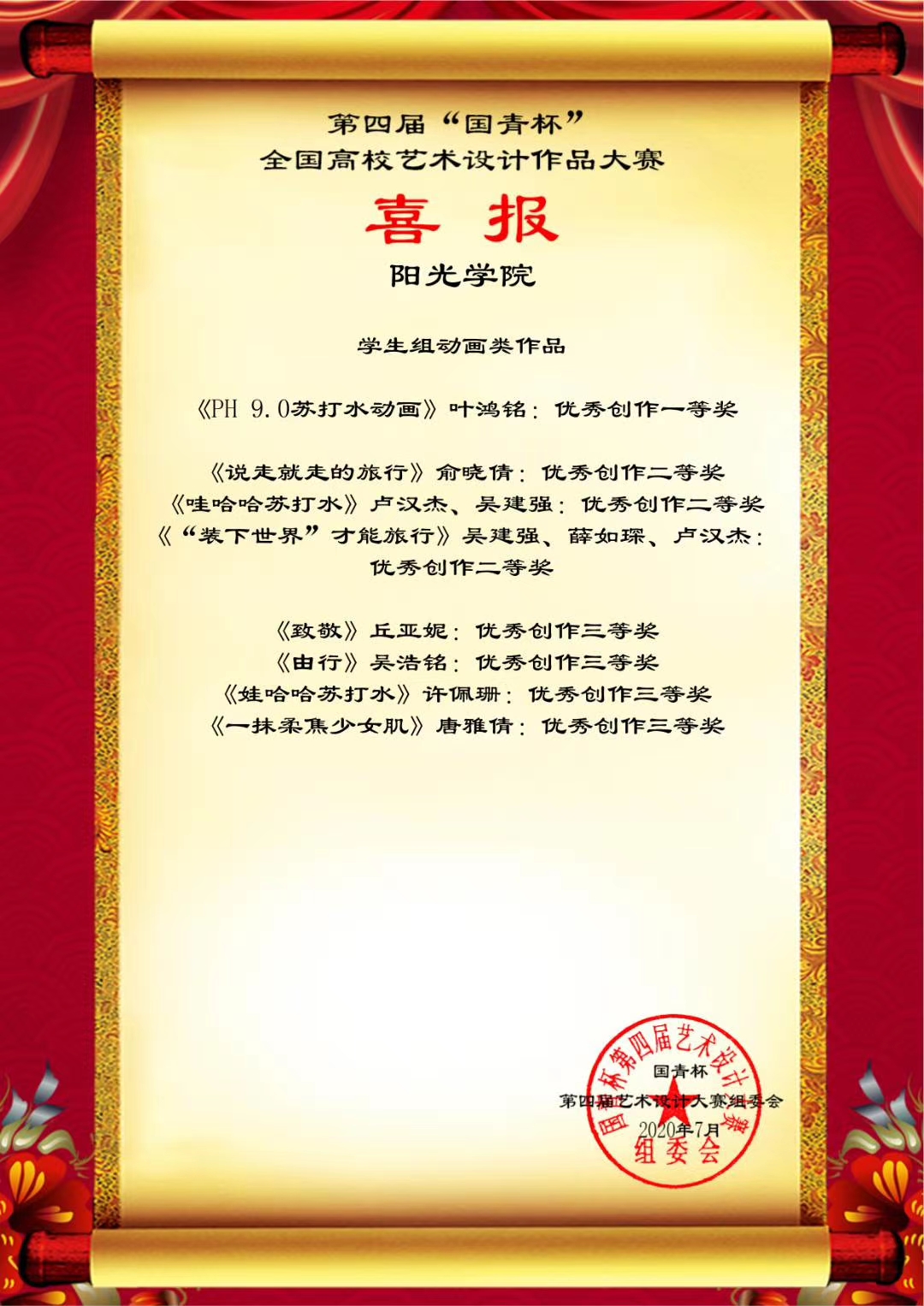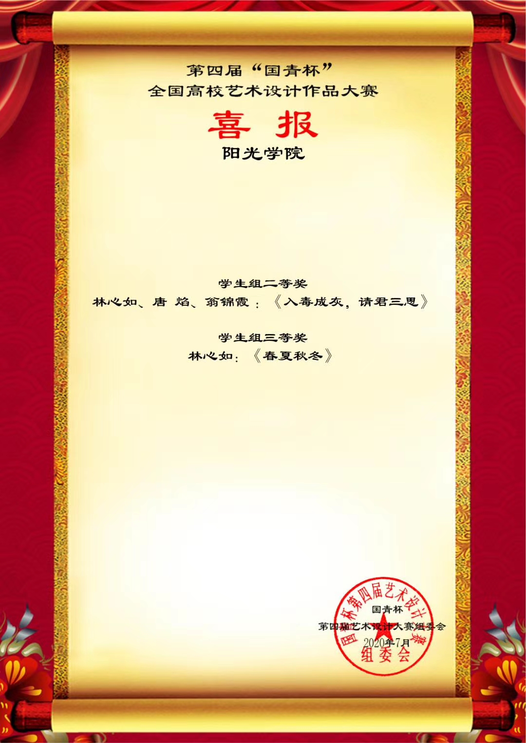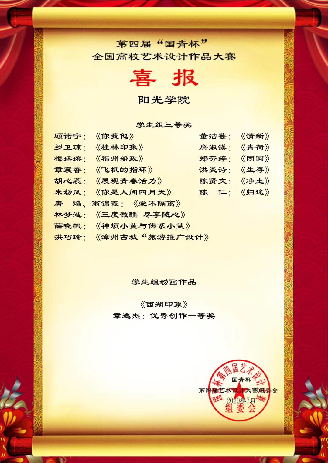 日前,第四届“国青杯”全国高校艺术设计作品大赛结果公布,设计公司师生在评展中荣获多项等级奖。此次线上获奖将获得参加由国青创新教育管理集团、澳门国青商公司等单位主办、承办的第六届中国企业形象建设年会的资格。