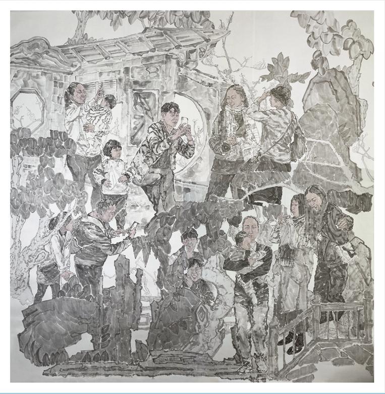 该作品采用人景相结合的形式,通过对十四个游玩公园的人物形态、表情、动作等进行细致描绘和刻画,表现出人物内心对生活美好的期待。该作品画面设色简淡,主要通过墨色的深浅变化来表现,使得画面保持一种简单朴素的风格,同时也展现出水墨画墨色淋漓的风味。