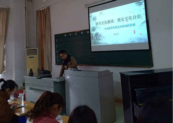 陈志平老师首先为我们阐述了何为优秀的传统文化,结合实际让我们认识到取传统文化之精华,去其糟粕的重要性。待同学们了解到中国传统文化的优点后,老师列举出大家熟知的“中国精神”,将中国优秀的传统文化和西方文化进行对比,深入浅出,引起了同学们的共鸣。通过老师的讲解,同学们逐渐认识到中国传统文化的优势,心中油然而起一阵自豪和自信。最后,陈老师从“加强学习”“注重普及”“强调应用”“做到创造性转化”四个方面号召大家坚守文化源泉、坚定文化自信。