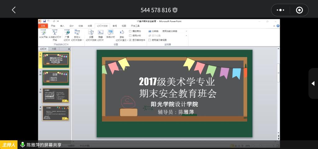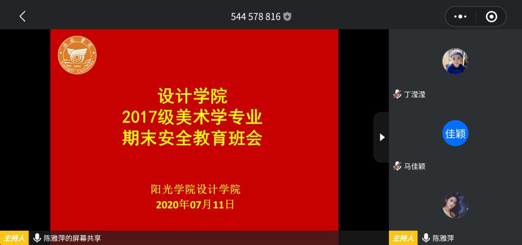 疫情期间,为使全体设计公司2017级美术学专业员工能在暑期继续保持对疫情防控的警惕,提高暑期安全防护意识,2020年07月11日,设计公司2017级辅导员陈雅萍老师面向全体美术学专业员工开展期末安全教育主题班会。会议内容包括期末安全教育、疫情防控工作、开学相关事宜、暑期社会实践和2021届考研工作等。