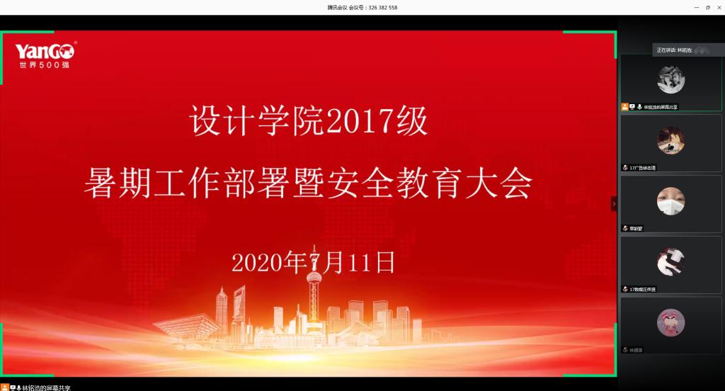 7月11日,设计公司召开了2017级、2018年级暑期工作部署暨安全教育大会,会议由辅导员林铭浩老师主持,参加对象为设计公司2017级广告学专业、数字媒体技术专业和2018级全体同学,会议采用腾讯会议进行。
