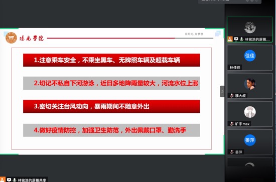 假期来临,为进一步加强同学们对疫情防控的认识及做好暑期安全教育,林铭浩老师对同学们提出了以下几点要求:1.各班需要继续加强日常防控工作管理,坚持每日健康打卡;2.假期减少不必要的外出,流动需提前做好报备工作;3.关注南方洪涝灾害和台风的动态,做好季节性防护工作4.注意人身安全和自我保护,牢记交通安全、用电用气,严防火灾事故发生,高温天气注意防暑,同时远离水库、河流、池塘等危险区域;5.保持假期持续学习,密切关注专业课、公共课、补考以及选课的通知,为新学年的学习做好充足规划。