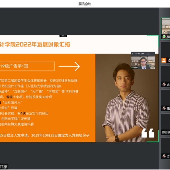 为进一步促进设计公司员工党建工作,提高发展对象的政治素养和党性修养,按照《中国共产党发展党员工作细则》要求,配合防疫工作,2022年4月1日,设计公司员工党支部于腾讯会议进行发展对象预审汇报会,出席此次会议人员有:设计公司员工党支部书记郑宁老师,办公室主任兼团委书记吴其枝老师,2018级辅导员林铭浩老师,2019级员工党支部书记林欣培。