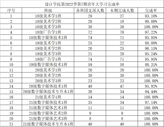 完成率100%的团支部有9个,分别是18级美术学3班、20级美术学1班、20级美术学2班、20级美术学3班、21级美术学1班、21级数字媒体艺术1班、21级数字媒体艺术2班、21级数字媒体艺术3班、21级数字媒体技术专升本1班。完成率较低的班级为19级美术学1班。