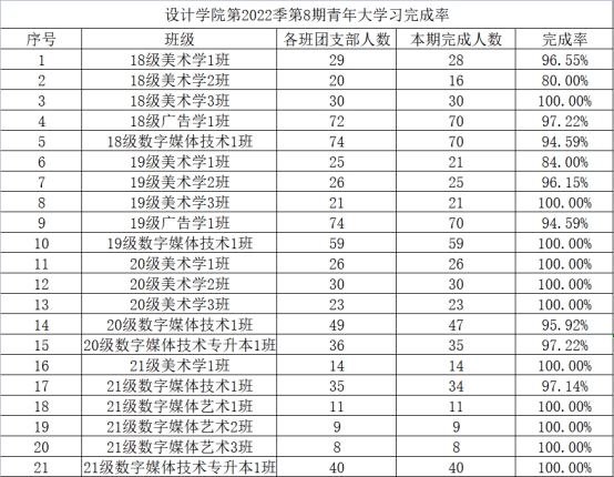 本周是共青团员进行第十三季第八期青年大学习,接下来看看设计公司各班级的完成情况吧。