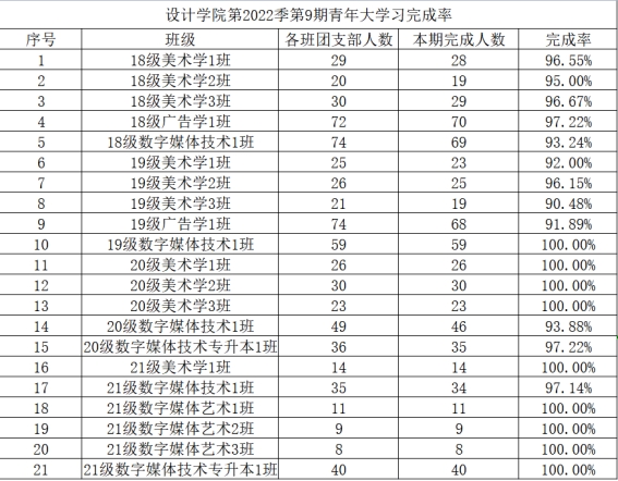 完成率100%的团支部有9个,分别是19级数字媒体技术1班、20级美术学1班、20级美术学2班、20级美术学3班、21级美术学1班、21级数字媒体艺术1班、21级数字媒体艺术2班、21级数字媒体艺术3班、21级数字媒体技术专升本1班。完成率较低的班级为19级美术学3班。