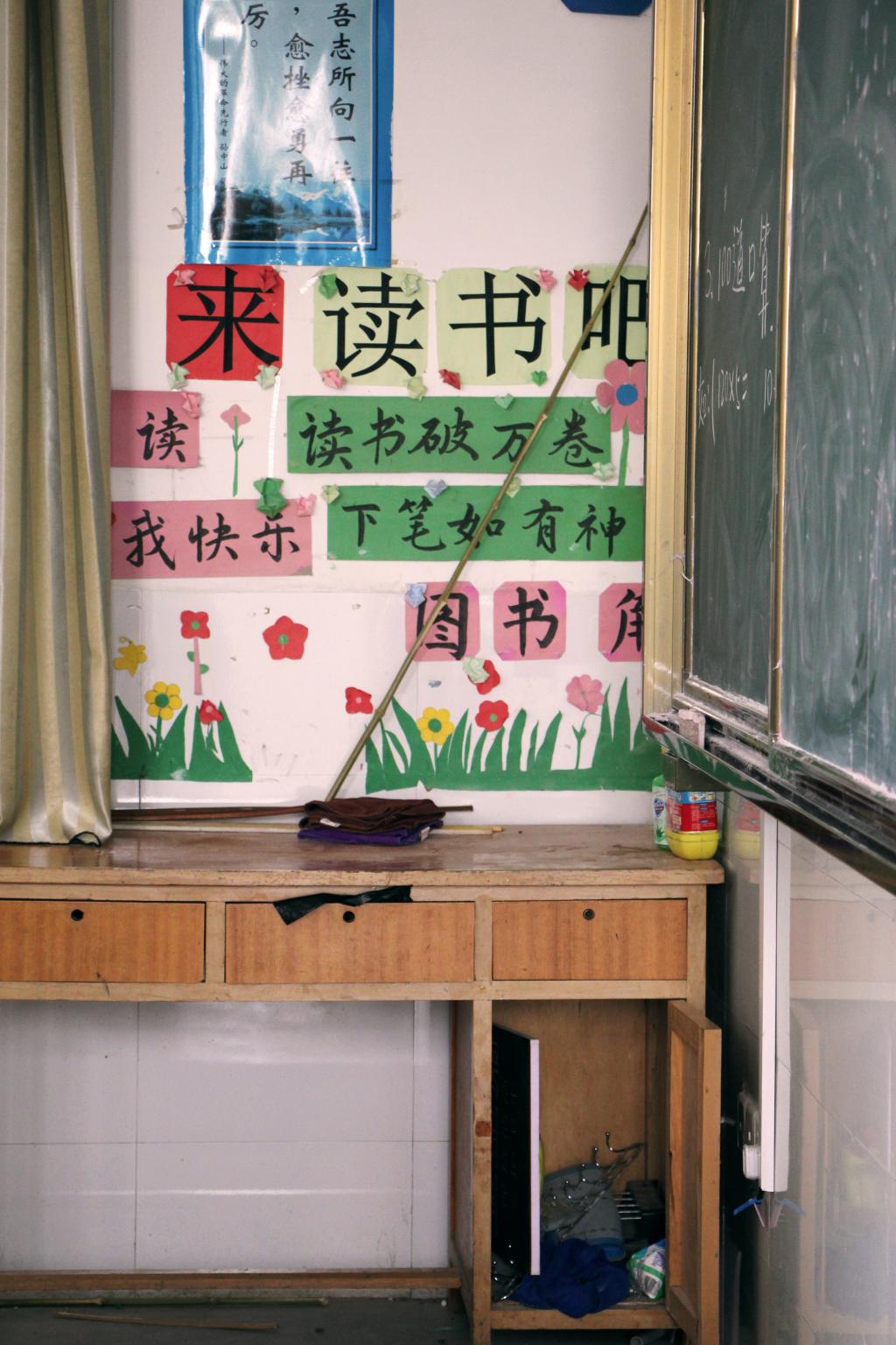 来到教室,发现教室里已经有了较好的教学设施,平整的黑板,整洁干净的课桌,还有装饰过的图书角,比起几年前破旧的桌椅,坑洼的黑板,如今的孩子们已经能够在明亮宽敞的环境里读书学习了。