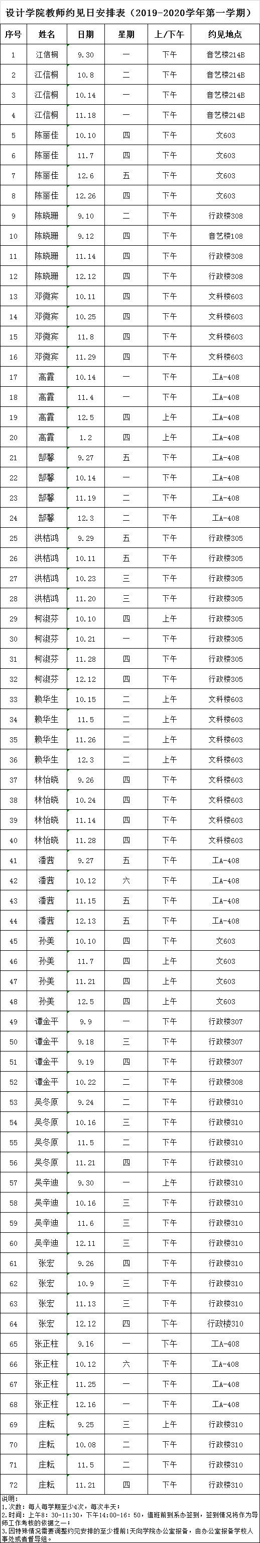 设计公司教师约见日安排表(2019-2020学年第一学期)