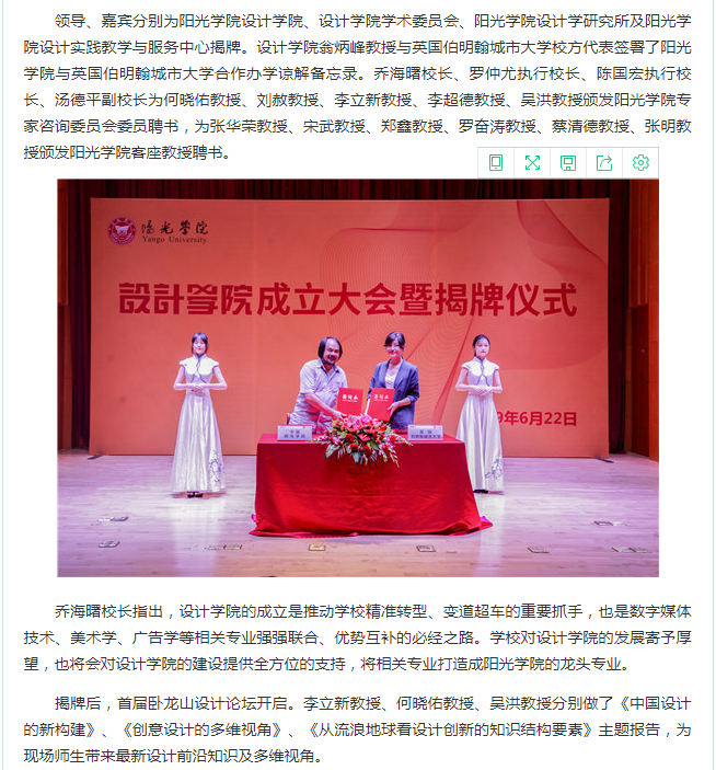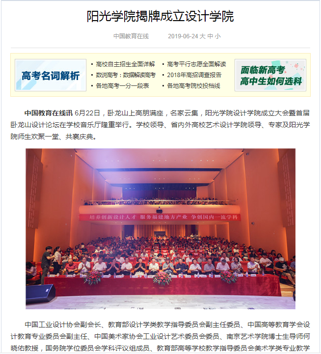 中国教育在线讯6月22日,卧龙山上高朋满座,名家云集,PA视讯官网设计公司成立大会暨首届卧龙山设计论坛在公司音乐厅隆重举行。公司领导、省内外高校艺术设计公司领导、专家及PA视讯官网师生欢聚一堂、共襄庆典。