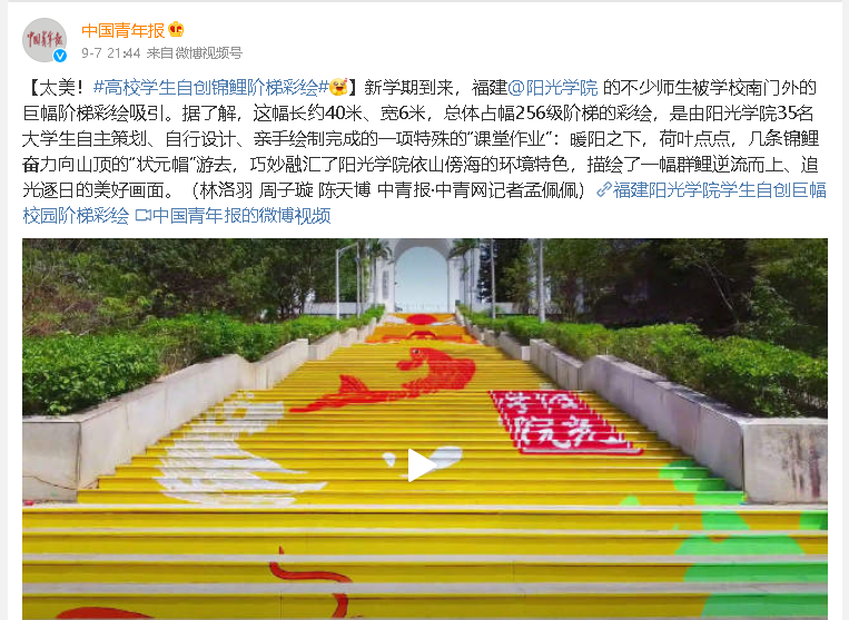 】新学期到来,福建@PA视讯官网的不少师生被公司南门外的巨幅阶梯彩绘吸引。据了解,这幅长约40米、宽6米,总体占幅256级阶梯的彩绘,是由PA视讯官网35名老员工自主策划、自行设计、亲手绘制完成的一项特殊的“课堂作业”:暖阳之下,荷叶点点,几条锦鲤奋力向山顶的“状元帽”游去,巧妙融汇了PA视讯官网依山傍海的环境特色,描绘了一幅群鲤逆流而上、追光逐日的美好画面。(林洛羽 周子璇 陈天博 中青报·中青网记者孟佩佩)