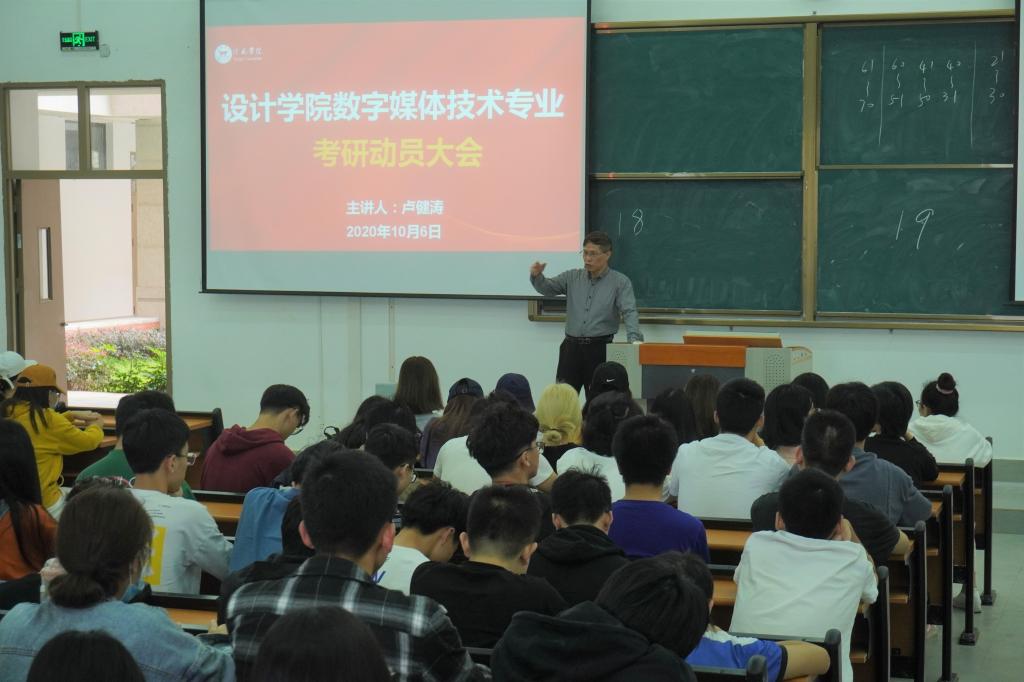 为进一步加强学风建设,调动公司学子的考研积极性,力求在2021年研究生考试中有新的突破,设计公司于10月6日上午在人1-西1教室召开了数字媒体技术专业考研动员大会。公司数字媒体技术专业领头人卢健涛教授、办公室主任兼团委书记吴其枝、辅导员林铭浩以及2018、2019级数字媒体技术专业全体员工参加了此次大会。会议由卢健涛教授主讲。
