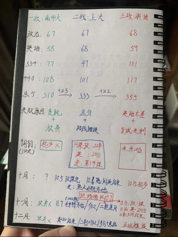 2022年从事新媒体编辑每天“朝九晚五”,还算轻松安逸,就是偶尔要帮甲方改广告文案需要加班。当时他遇到了精神危机,思考起了人生的意义和死亡哲学,他在想是不是一辈子就这样了?呆在小县城,和他爸妈给我规划的一样,娶妻生子,混混日子,度过一生。他还是不甘心,觉得就是要为了自己的目标继续奋斗,开始了在职三战,那个时候已经10月份了,他就下了班,五点半开始,看专业课,最后把之前二战的笔记看了一遍,还有其他的一些基础知识;英语就是中午休息,做一篇英语二真题,抽空背背单词;政治每天22:30回家看徐涛网课,再做肖秀荣1000题。最后考了355,正好达到了国家线,但是复试被刷,他一边开车下班一边哭。